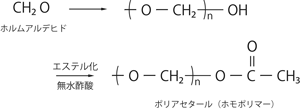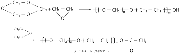 - ホルムアルデヒドの3分子環状重合物であるトリオキサンに数%のエチレンオキシドを混合し、触媒を用いてカチオン重合する。